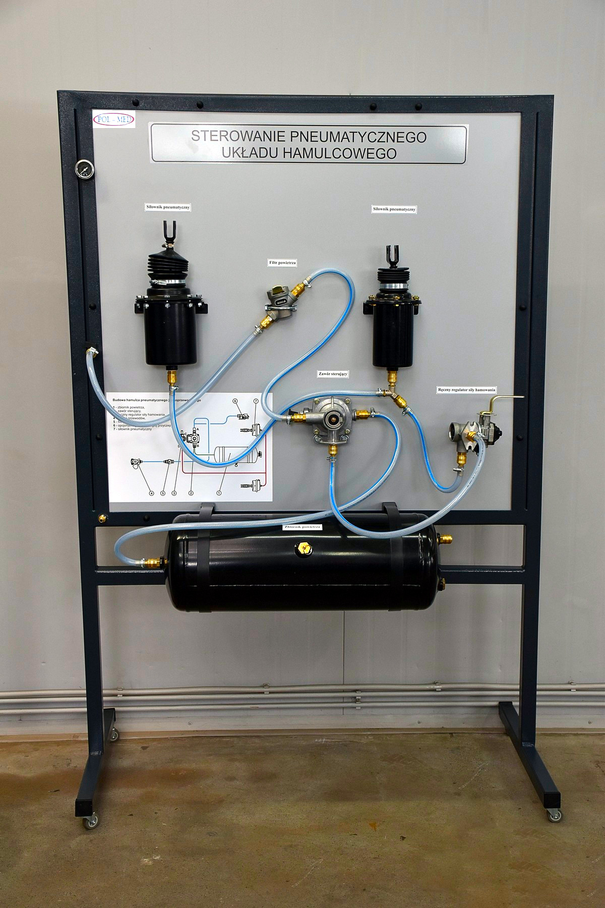 Demonstration bench showing operation of a heavy-vehicle pneumatic brake system with working pressure simulation.